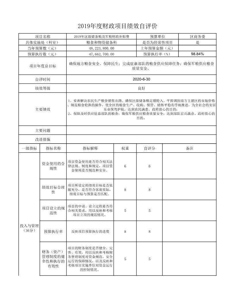 索引号: 00001434-9/2020-00034 发布机构: 区商务委 发文日期: 2020年09月09日 主题分类: 绩效评价 关键词: 2019年度财政项目支出绩效自评表(2019年区级储备粮及军粮财政补贴费) 发布时间:2020-09-09 浏览次数: 次 【字体:小 大】 2019年度财政项目支出绩效自评表(2019年区级储备粮及军粮财政补贴费).pdf