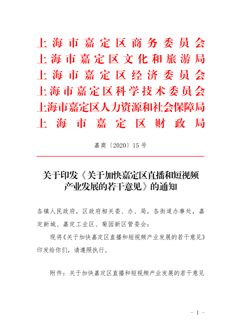 索引号: WH2303000-2020-013 发布机构: 区商务委 生效日期: 2020年11月30日 文 号: 嘉商〔2020〕15号 关键词: 主题分类: 各部门文件 上海市嘉定区商务委员会 嘉商〔2020〕15号 关于印发《关于加快嘉定区直播和短视频 产业发展的若干意见》的通知 发布时间:2020-11-30 浏览次数: 次 【字体:小 大】 关于印发《关于加快嘉定区直播和短视频 产业发展的若干意见》的通知.pdf