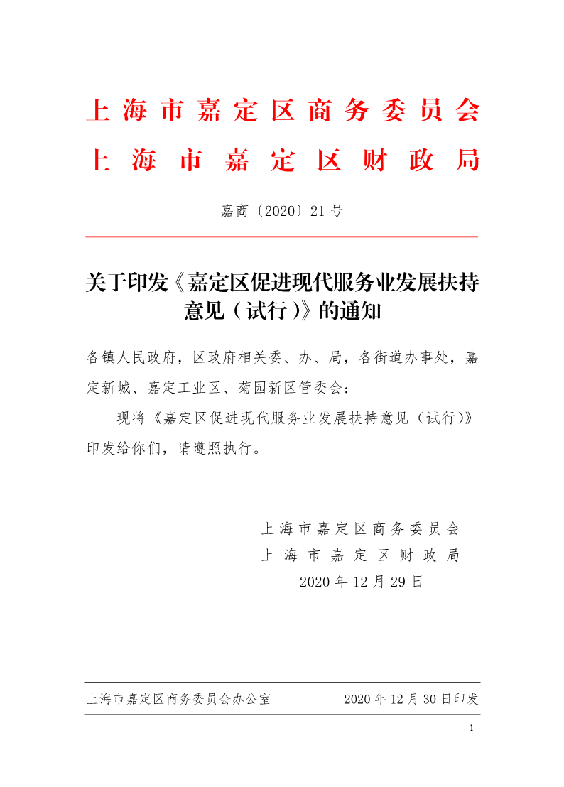 索引号: WH2303000-2021-001 发布机构: 区商务委 生效日期: 2020年12月30日 文 号: 嘉商〔2020〕21号 关键词: 主题分类: 各部门文件 上海市嘉定区商务委员会 嘉商〔2020〕21号 关于印发《嘉定区促进现代服务业发展扶持意见(试行)》的通知 发布时间:2020-12-29 浏览次数: 次 【字体:小 大】 关于印发《嘉定区促进现代服务业发展扶持意见(试行)》的通知.pdf