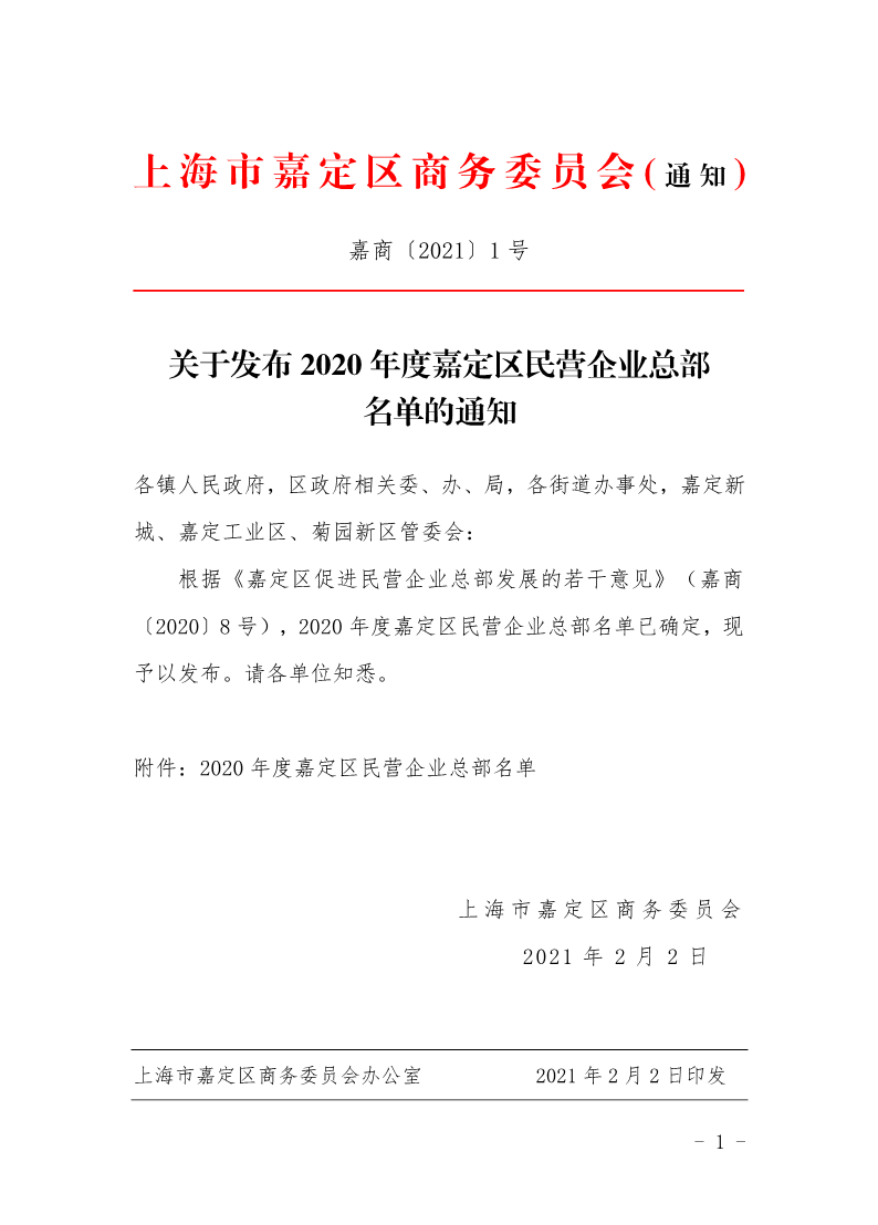 索引号: WH2303000-2021-003 发布机构: 区商务委 生效日期: 2021年02月02日 文 号: 嘉商〔2021〕1号 关键词: 主题分类: 各部门文件 上海市嘉定区商务委员会 嘉商〔2021〕1号 关于发布2020年度嘉定区民营企业总部名单的通知 发布时间:2021-02-02 浏览次数: 次 【字体:小 大】 关于发布2020年度嘉定区民营企业总部名单的通知.pdf
