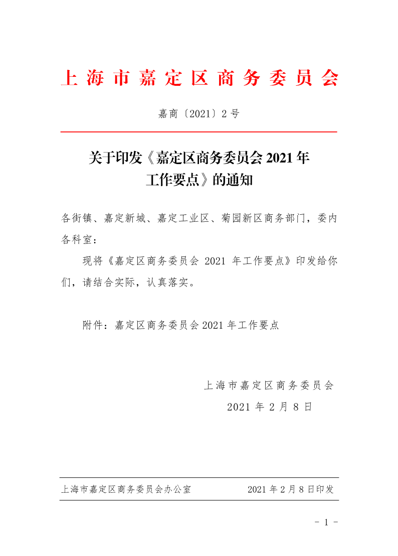 索引号: WH2301000-2021-004 发布机构: 区商务委 生效日期: 2021年02月08日 文 号: 嘉商〔2021〕2号 关键词: 主题分类: 各部门文件 上海市嘉定区商务委员会 嘉商〔2021〕2号 关于印发《嘉定区商务委员会2021年工作要点》的通知 发布时间:2021-02-08 浏览次数: 次 【字体:小 大】 关于印发《嘉定区商务委员会2021年工作要点》的通知.pdf
