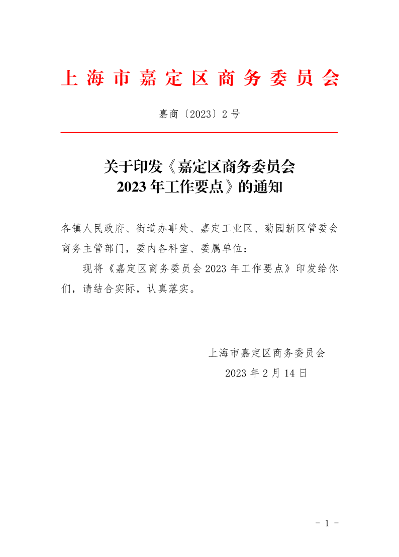 索引号: WH2303000-2023-002 发布机构: 区商务委 生效日期: 2023年02月15日 文 号: 嘉商(2023)2号 关键词: 主题分类: 各部门文件 上海市嘉定区商务委员会 嘉商(2023)2号 关于印发《嘉定区商务委员会2023年工作要点》的通知 发布时间:2023-02-15 浏览次数: 次 【字体:小 大】