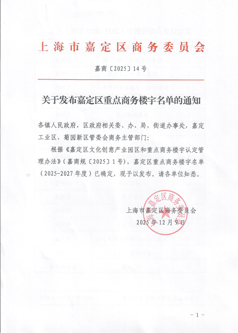根据《嘉定区文化创意产业园区和重点商务楼宇认定管理办法》(嘉商规〔2025〕1号),嘉定区重点商务楼宇名单(2025-2027年度)已确定,现予以发布。请各单位知悉。